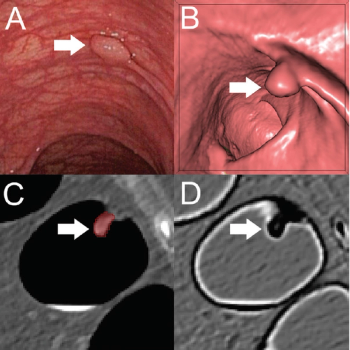 Implementing a radiomics-based machine learning algorithm allows CT colonography to differentiate between benign and pre-cancerous polyps with high sensitivity and specificity.