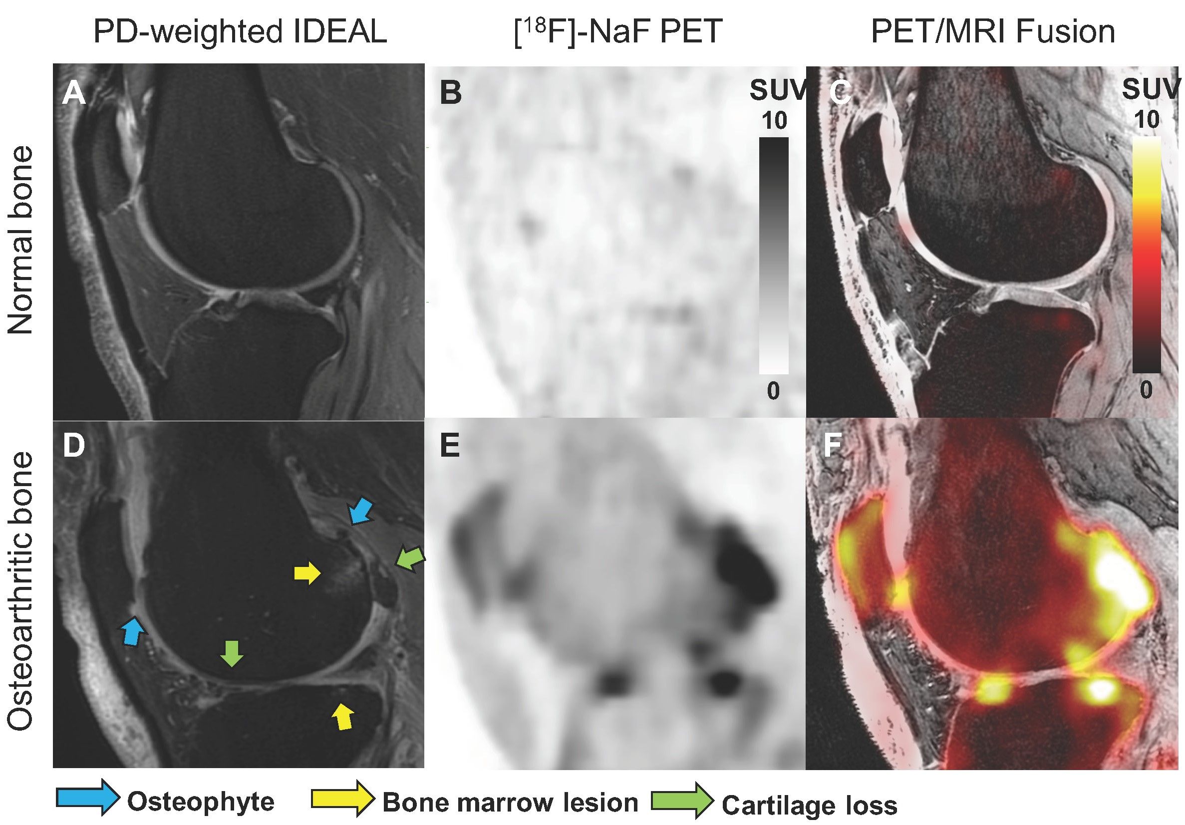 Figure 2. Representative structural MRI image (PD-weighted IDEAL image, A and D), [18F]NaF PET SUV images (B and E), and PET/MR fusion images (C and F) of a healthy knee and a knee with osteoarthritis. MOAKS scoring of MR images was used to identify the size of osteophytes, bone marrow lesions and cartilage loss within various bone regions in the patella, tibia and femur. Arrows highlight bone regions with osteophytes in blue, bone marrow lesions in yellow, and cartilage loss in green. Credit: LE Watkins, et al., Stanford University, CA.