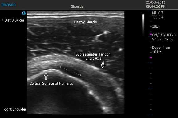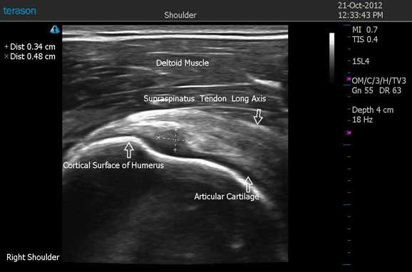 Findings: Long axis and short-axis views of the long head of the biceps tendon, subscapularis tendon, supraspinatus tendon, infraspinatus tendon, teres minor tendon, acromioclavicular joint, and subacromial impingement test of the right shoulder were obtained using a Terason t3200 portable ultrasound system.
